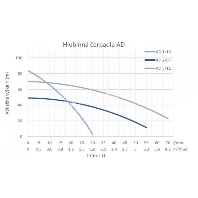 Hlubinné 4" ponorné čerpadlo pro hluboké vrty až do ponoru 250 m. Čerpadlo s vysoce kvalitním motorem vyrobeným v ČR s dlouhou životností, vhodné i pro nejnáročnější aplikace. Vyrobeno z nerezové oceli odolné proti korozi a otěru. Čerpadla řady AD splňují nejvyšším nároky na energetickou účinnost. Vhodné pro čerpání čisté vody, pro dodávky vody do domu, zavlažování a další aplikace. Maximální průtok 1,8-4,2 m3/hod a maximální výtlak 48-104 m.