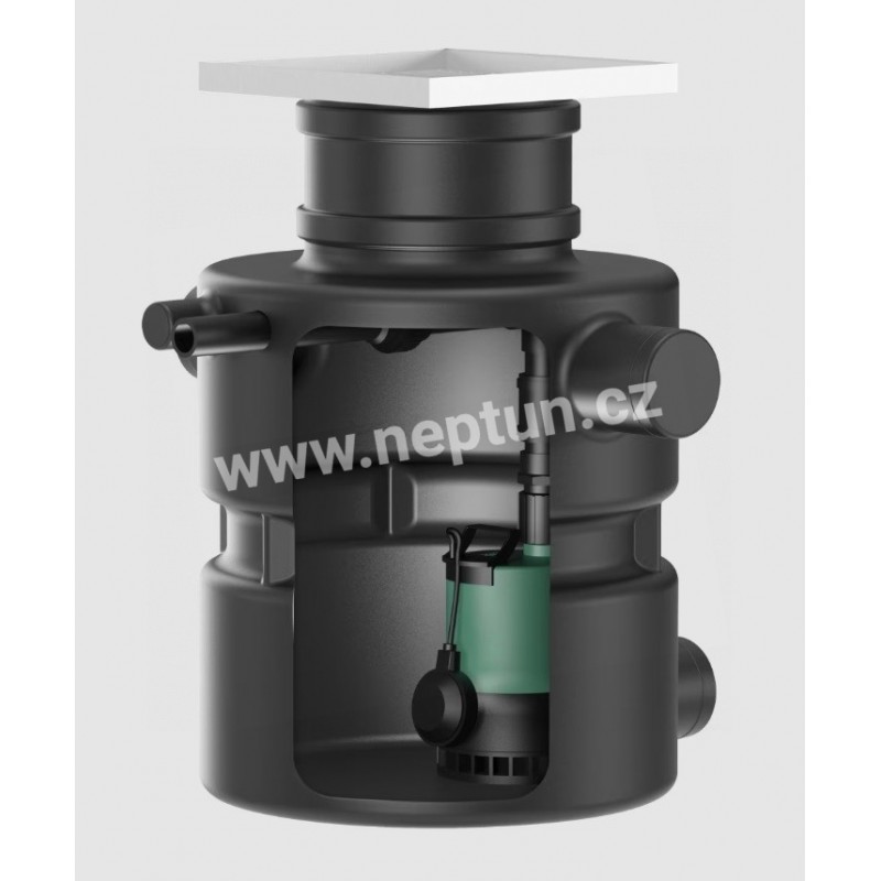 Plynotěsná a vodotěsná sběrná nádrž z plastu s vnitřním prostorem bez usazenin. Dvě přípojky DN 100 posunuté o 180° pro přítok, odvzdušnění a vedení kabelů. Přípojka výtlaku je od obou přípojek posunuta o 90° na stranu. Pro snadnou údržbu zařízení slouží kryt jako revizní otvor.