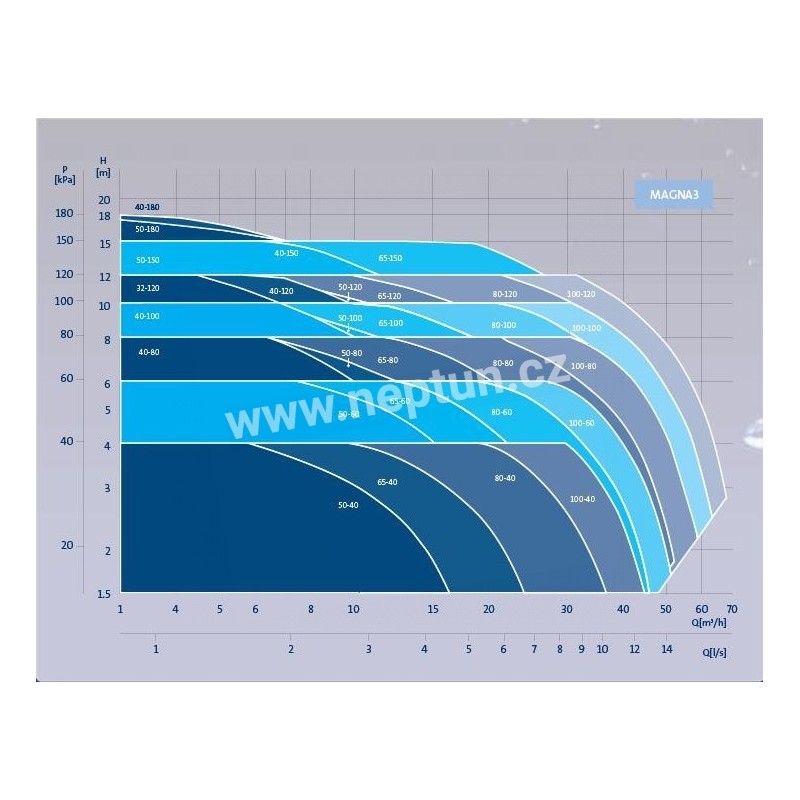 Řada MAGNA3 zahrnuje širokou řadu malých, středních a velkých oběhových čerpadel určených pro vytápění, klimatizaci a chlazení ve větších budovách a průmyslových objektech. MAGNA3 je nejnovějším členem řady úsporných a vysoce kvalitních oběhových čerpadel Grundfos, které navazuje na úspěšnou a prověřenou technologii řady MAGNA.S MAGNA3 si nemusíte dělat starosti s nastavením provozního režimu čerpadla. Čerpadlo stačí instalovat a ponechat tovární nastavení AUTOADAPT. Díky funkci AUTOADAPT čerpadlo MAGNA3 automaticky analyzuje požadavky otopné soustavy a přizpůsobuje svůj provoz těmto požadavkům. S každou změnou podmínek čerpadlo změní svůj provozní bod. Výsledkem je optimální komfort s minimální spotřebou energie. Čerpadla MAGNA3 jsou extrémně spolehlivá, flexibilní a nevyžadují téměř žádnou údržbu. Mohou bezdrátově komunikovat pomocí IR a umožňují externí řízení a monitorování pomocí přídavných komunikačních modulů.