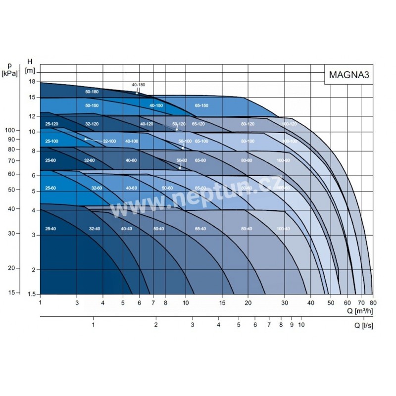 Řada MAGNA3 zahrnuje širokou řadu malých, středních a velkých oběhových čerpadel určených pro vytápění, klimatizaci a chlazení ve větších budovách a průmyslových objektech. MAGNA3 je nejnovějším členem řady úsporných a vysoce kvalitních oběhových čerpadel Grundfos, které navazuje na úspěšnou a prověřenou technologii řady MAGNA. S MAGNA3 si nemusíte dělat starosti s nastavením provozního režimu čerpadla. Čerpadlo stačí instalovat a ponechat tovární nastavení AUTOADAPT. Díky funkci AUTOADAPT čerpadlo MAGNA3 automaticky analyzuje požadavky otopné soustavy a přizpůsobuje svůj provoz těmto požadavkům. S každou změnou podmínek čerpadlo změní svůj provozní bod. Výsledkem je optimální komfort s minimální spotřebou energie. Čerpadla MAGNA3 jsou extrémně spolehlivá, flexibilní a nevyžadují téměř žádnou údržbu. Mohou bezdrátově komunikovat pomocí IR a umožňují externí řízení a monitorování pomocí přídavných komunikačních modulů.