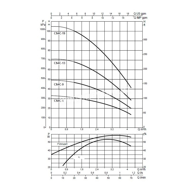 Stupeň krytí: IP 58 Třída izolace: B Čerpaná kapalina: čistá, bez pevných či abrazivních částic, nikoli vazká, neagresivní, nekrystalizující, chemicky neutrální, vlastnostmi blízká vodě. Rozsah teploty kapaliny: od 0°C do 40°C Max. počet spuštění: 20 /hod. Proudění chladící kapaliny: 8 cm/sec. Max. obsah rozptýleného písku: 60 g/m3 Součástí dodávky jednofázových čerpadel je rozběhová skříňka. Čerpadla se užívají pro odčerpávání vody,pro tlakování a dodávku vody do rozvodů malých i velkých objektů občanských i průmyslových, dále pro zavlažovací, mycí i protipožární systémy. S ohledem na dodávané množství jsou rozdělena do čtyř typových velikostí. V každé typové velikosti je dále výběr dle počtu stupňů co do výtlačné výšky. Takto je možno zvolit optimální čerpadlo pro danou aplikaci. Čerpadla jsou odstředivá, vícestupňová s radiálními, nebo radiaxiálními oběžnými koly. S elektromotorem jsou pevně, avšak snadno rozebíratelně spojena typizovanou přírubou. Přenos kroutícího momentu obstarává spojka s evolventním drážkováním. Hřídel a plášť čerpadla jsou nerezové oceli. Oběžná kola z technopolymeru mají sací kroužek chráněn nerezovou ocelí, těsnění sacího kroužku oběžného kola a těsnění mezi stupni je radiálně plovoucími abraziodolnými těsnícími kroužky. Výtlačné těleso se závěsnými oky a zpětnou klapkou, sací těleso, stejně jako difuzory, těleso ložiska i tělesa stupňů jsou z technopolymeru. Ponorný asynchronní dvoupólový elektromotor má veškeré mechanické díly vyrobeny z nerezové oceli AISI 304. Je podvěšen pod čerpadlem, výstupní hřídel je opatřena vnějším evolventním drážkováním. Axiální síly vyvolané čerpadlem jsou zachycovány mohutným axiálním ložiskem. Axiální i radiální ložiska jsou mazána a chlazena netoxickou nemrznoucí vodní náplní motoru. Stator je umístěn v nerezovém vodotěsném pouzdře. Odnímatelný plochý přívodní kabel je přiveden plastovou krycí lištou po plášti čerpadla. Provedení motoru může být třífázové a do určité velikosti i jednofázové s trvale připojeným kondenzátorem. Kondenzátor, spolu s nadproudovou ochranou jsou v rozběhové skříňce mimo čerpadlo. Ochranu motoru třífázového čerpadla je nutno zabezpečit zkratovým a nadproudovým jištěním v elektroinstalaci uživatele!