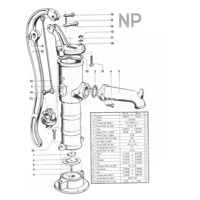 Čerpadla NP (NP 75 -NP 90) jsou určena k čerpání studniční vody bez obsahu mechanických nečistot do teploty 40°C. Pracovní píst je umístěn přímo v tělese nad studnou, z čehož vyplývá, že toto čerpadlo lze použít pro kopané nebo ražené studny o maximální hloubce 7 metru (přesněji řečeno svislá vzdálenost mezi horní polohou pístu a hladinou ve studni nesmí být vetší jak 7 metru - pamatujte na možný pokles hladiny ve studni). Součástí dodávky čerpadla není sací potrubí, odvodňovací zařízení ani sací koš. K čerpadlu NP 75 lze objednat podstavec o výšce 630 mm a hmotnosti 13 kg.