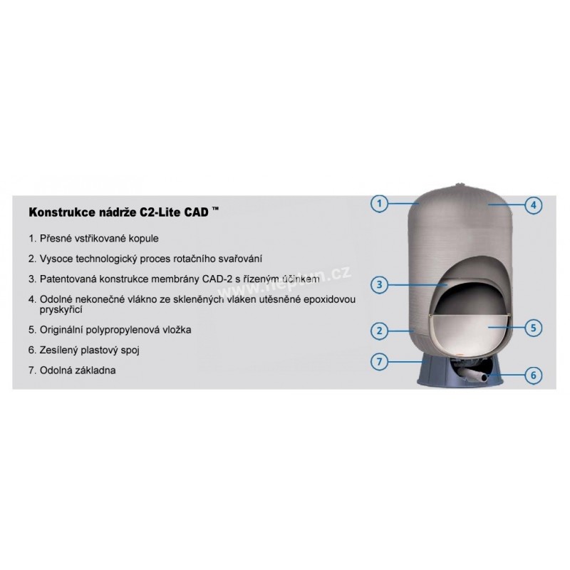 Na rozdíl od jiných kompozitních nádrží, které v plastovém plášti skrývají starou opotřebovanou technologii vaků, je patentovaná membránová konstrukce CAD-2 pevnější, nemačká se a neopotřebuje. Je vybavena 100% butylovou membránou s přesně tvarovanou kopolymerovou polypropylenovou vložkou pro prvotřídní oddělení vzduchu a vody. Tato patentovaná konstrukce umožňuje, aby každá velikost nádrže měla správně dimenzovanou vodní komoru odpovídající odběrovému výkonu dané nádrže.