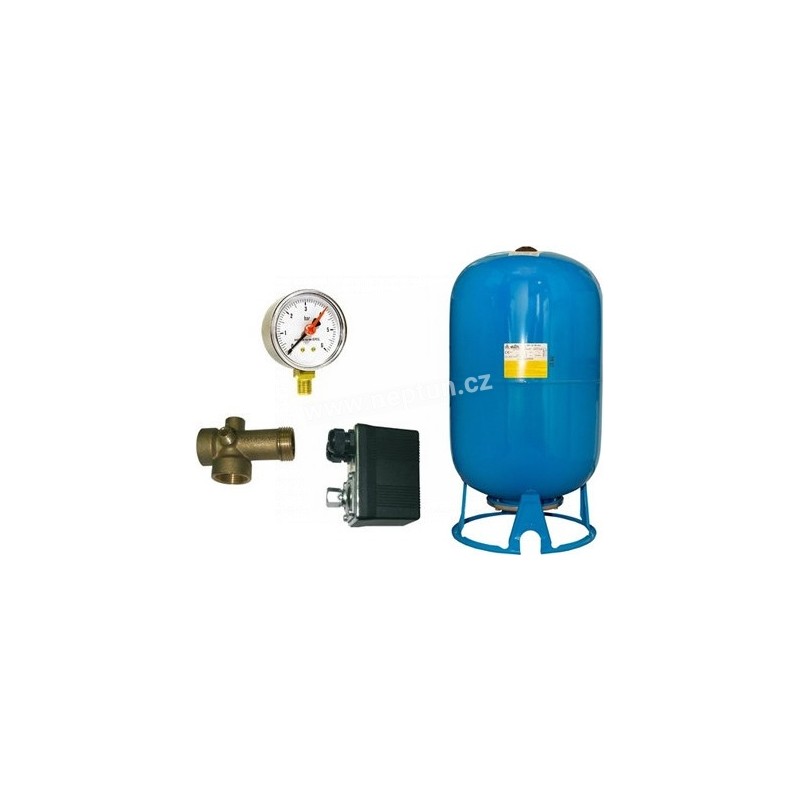 Kompletní sestava vodárny pro připojení samostatného ponorného nebo horizontálního čerpadla. Obsahuje vertikální tlakovou nádobu 100l, tlakový spínač v rozsahu 2 - 3,5 bar, manometr do 6 bar a pěticestnou armaturu.