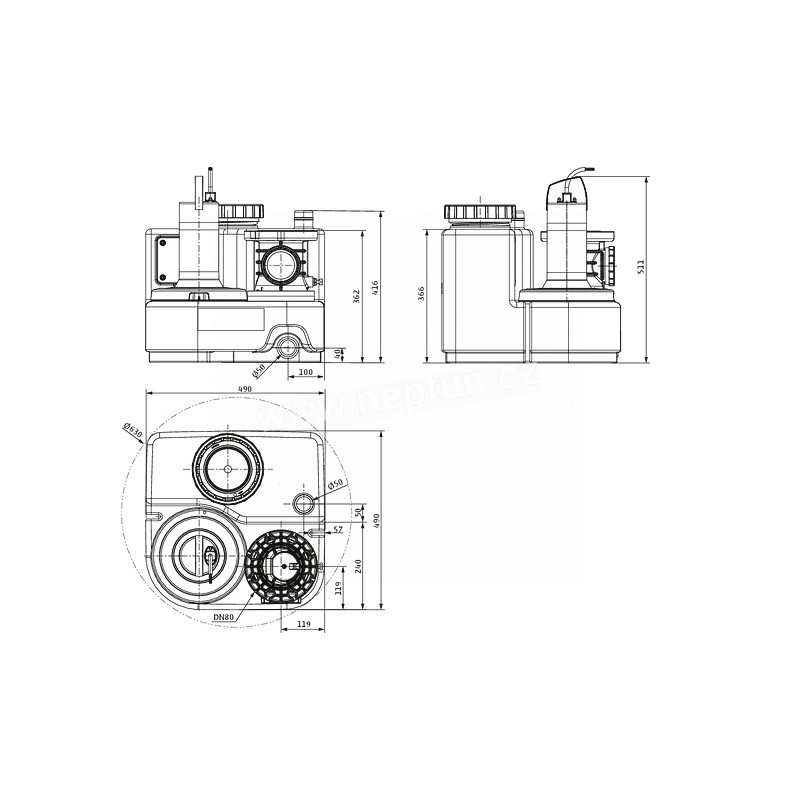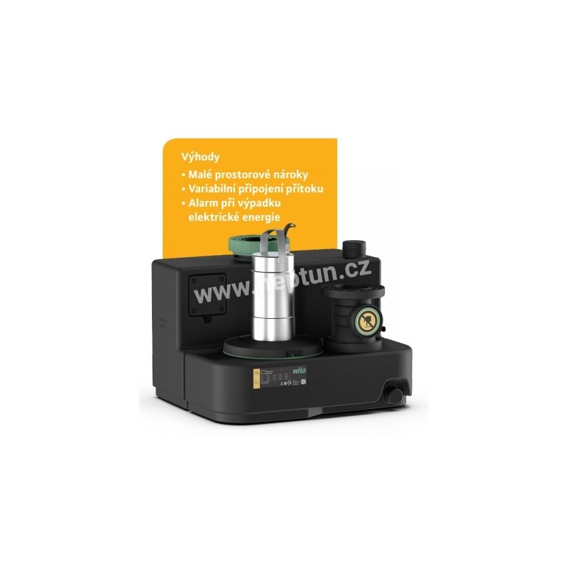 Kompaktní automatické přečerpávací zařízení na splaškové vody obsahující fekálie. Plynotěsná a vodotěsná nádrž s průhledným víkem revizního otvoru a nainstalovanou zpětnou klapkou na výtlaku DN 80. Dodává se s připojeným spínacím přístrojem, měřením hladiny a přívodním 1,5 m kabelem se zástrčkou. Integrovaný a autonomní alarm s kontaktem poruchového hlášení. Součástí dodávky jsou přírubová hrdla a těsnění výtlaku a odvětrávání, výkružník a těsnění nátoku DN 100, izolační rohož a 9 V akumulátor.