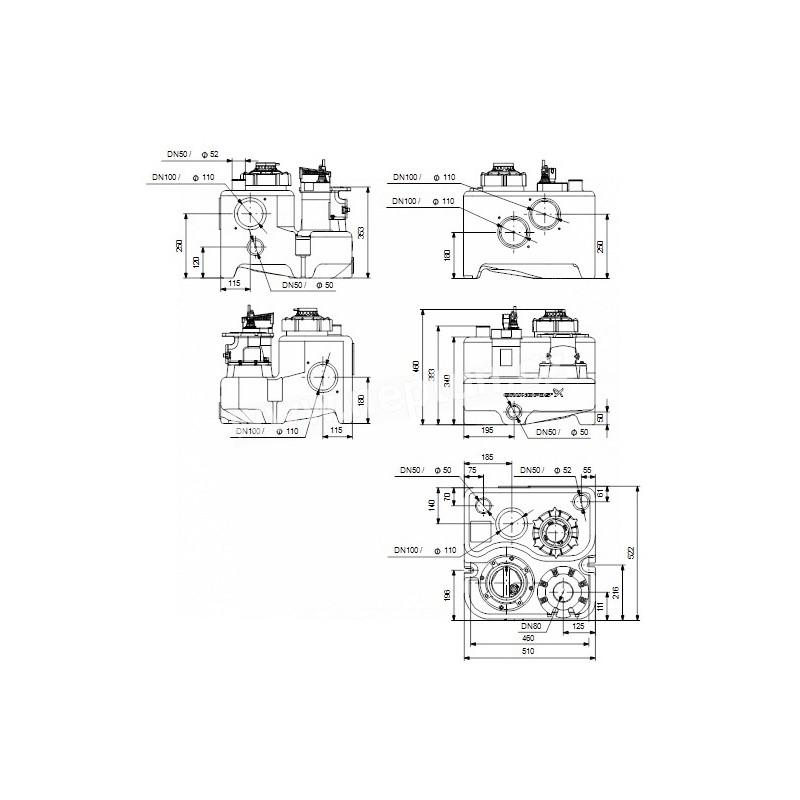 Plně integrovaná sběrná nádrž má veškerá potřebná hrdla pro připojení přívodního potrubí ve výškách 180 mm a 250 mm, odvzdušňovacího potrubí DN50 a ručně ovládaného membránového čerpadla (příslušenství).