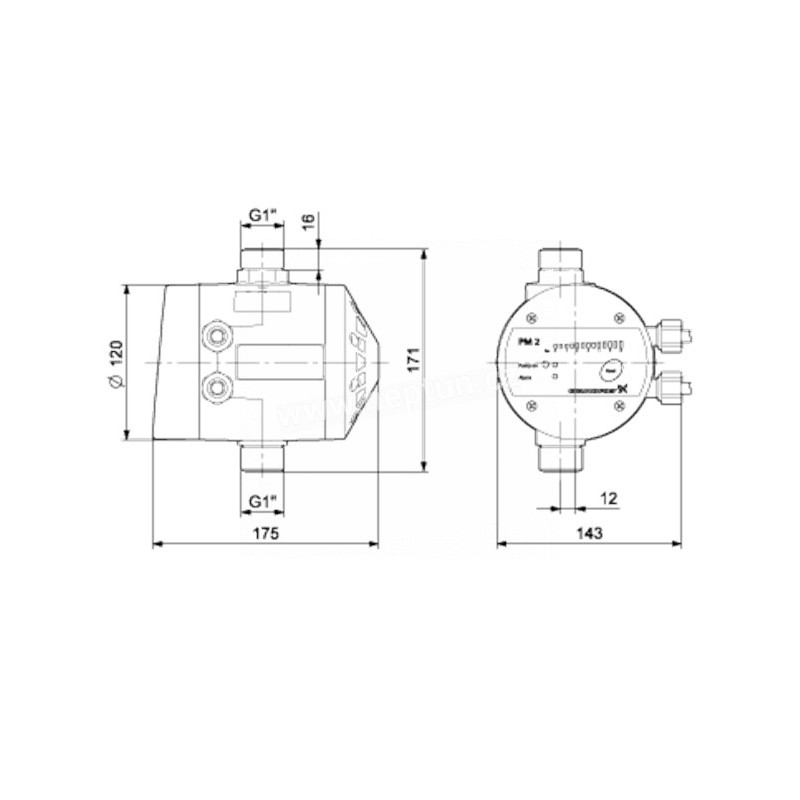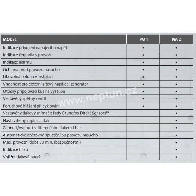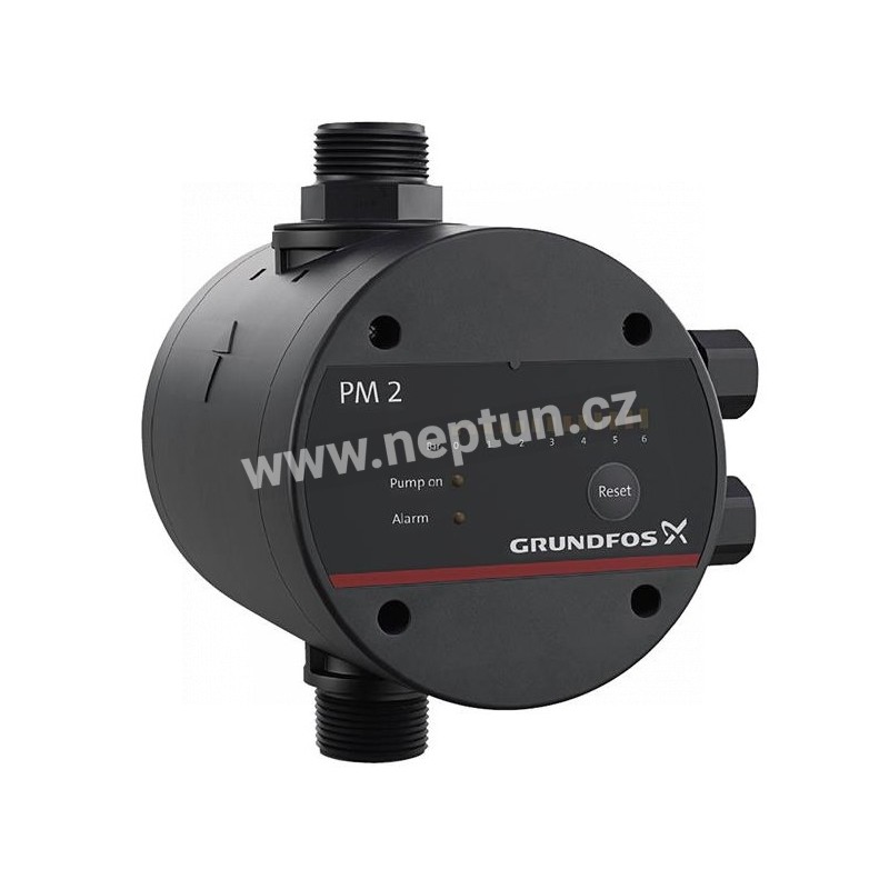 Tlaková řídicí jednotka Grundfos PM 2 je určena pro automatické zapínání/vypínání čerpadel Grundfos a dalších čerpadel pro dodávku vody. Jednotka PM 2 zajišťuje zapínání čerpadla při nastavitelném zapínacím tlaku 1.5 - 5 bar bar. To umožňuje přizpůsobení různým typům instalace a požadované úrovně komfortu.