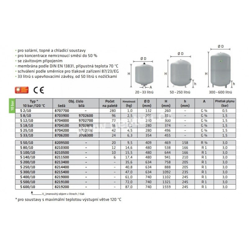 Tlaková expanzní nádoba s membránou pro uzavřené solární, topné a chladicí soustavy. Nádoby v provedení podle DIN EN 13831. Povolení podle směrnice o tlakových zařízeních 2014/68/EU.